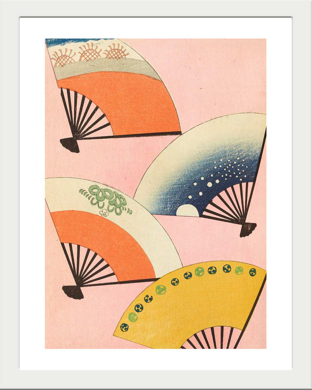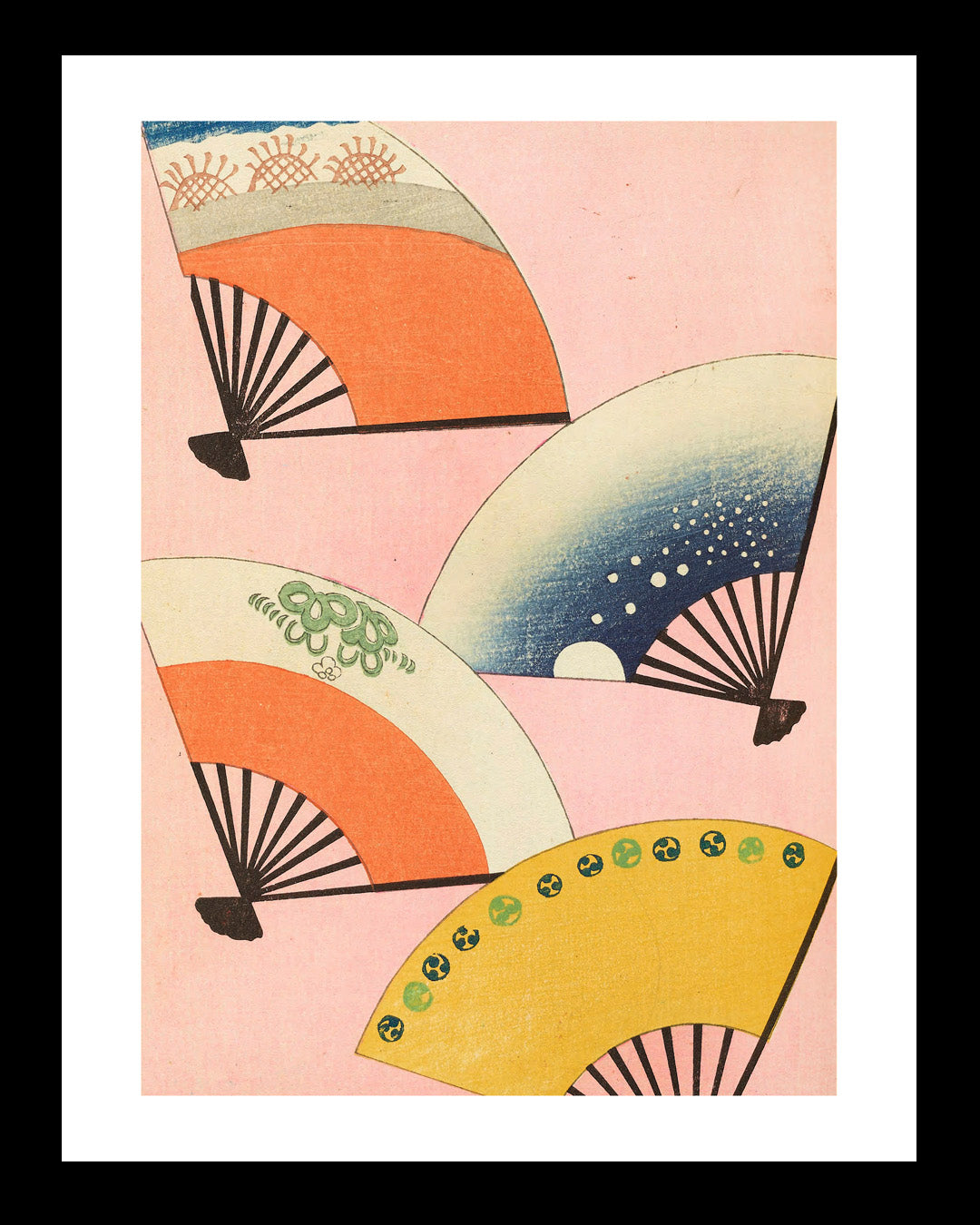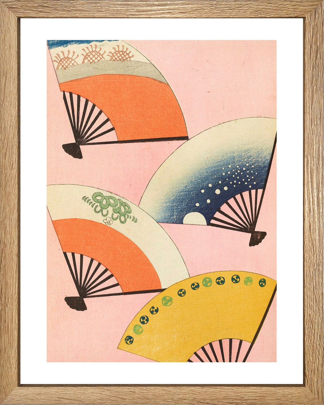 Cuadro de estilo japonés que captura la esencia del arte oriental con cuatro abanicos vibrantes en tonos contrastantes sobre un delicado fondo rosa pálido. Cada abanico representa una explosión de color y movimiento, creando una composición dinámica que desafía la serenidad tradicional. Perfecto para quienes se atreven a mezclar la elegancia clásica con un toque contemporáneo y audaz. Una pieza que transforma cualquier espacio en una galería de contraste visual.