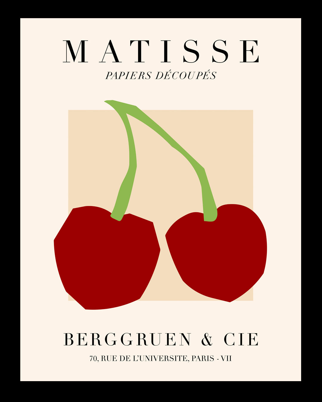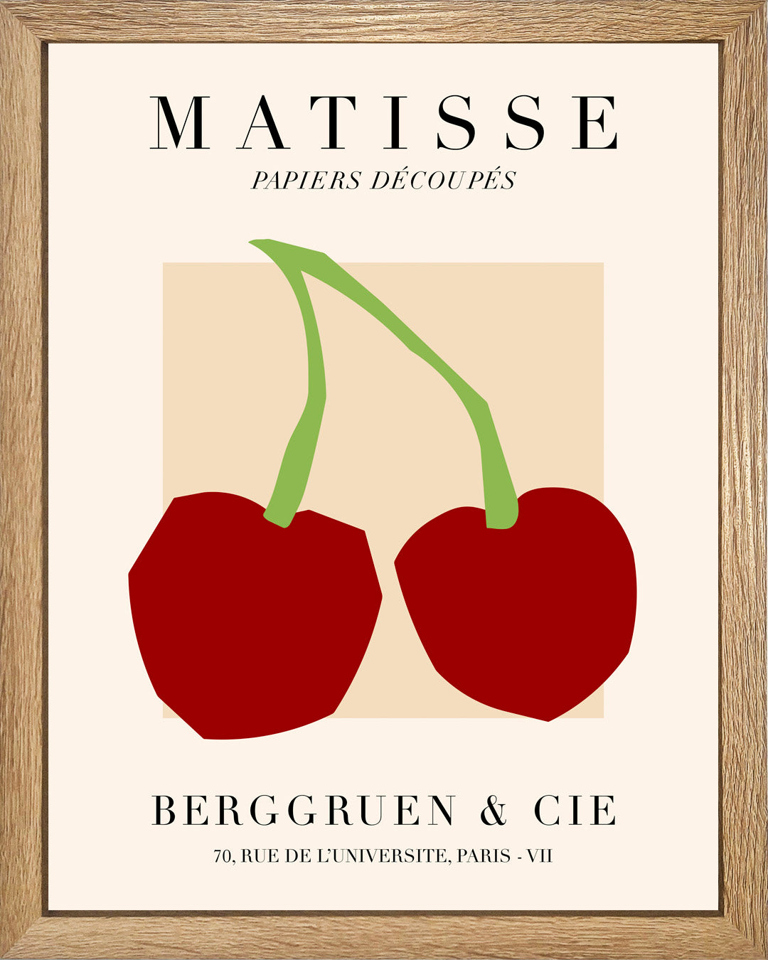 Inspirado en la audacia cromática de Matisse, este cuadro captura grandes cerezas rojas de proporciones monumentales que dominan el lienzo con presencia magnética. La fruta se despliega en toda su gloria, sus formas orgánicas y tonalidades intensas reflejando la pasión del maestro francés por el color puro y la simplificación formal. Una pieza que desafía la sutileza, proclamando belleza sin disimulos. Perfecta para quien se atreve a llevar arte revolucionario a sus espacios.