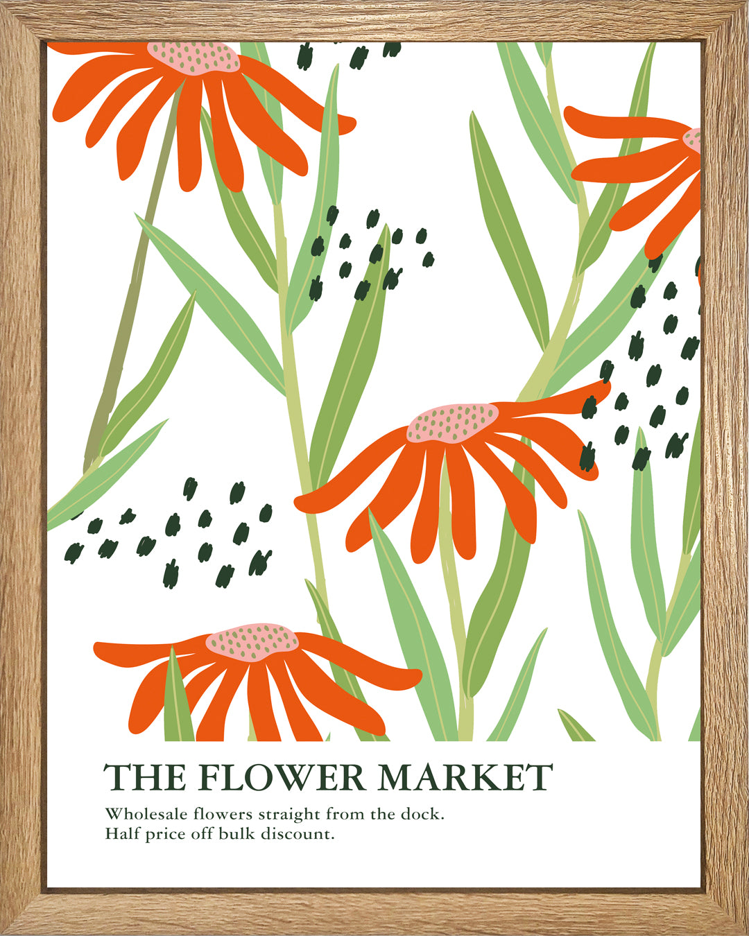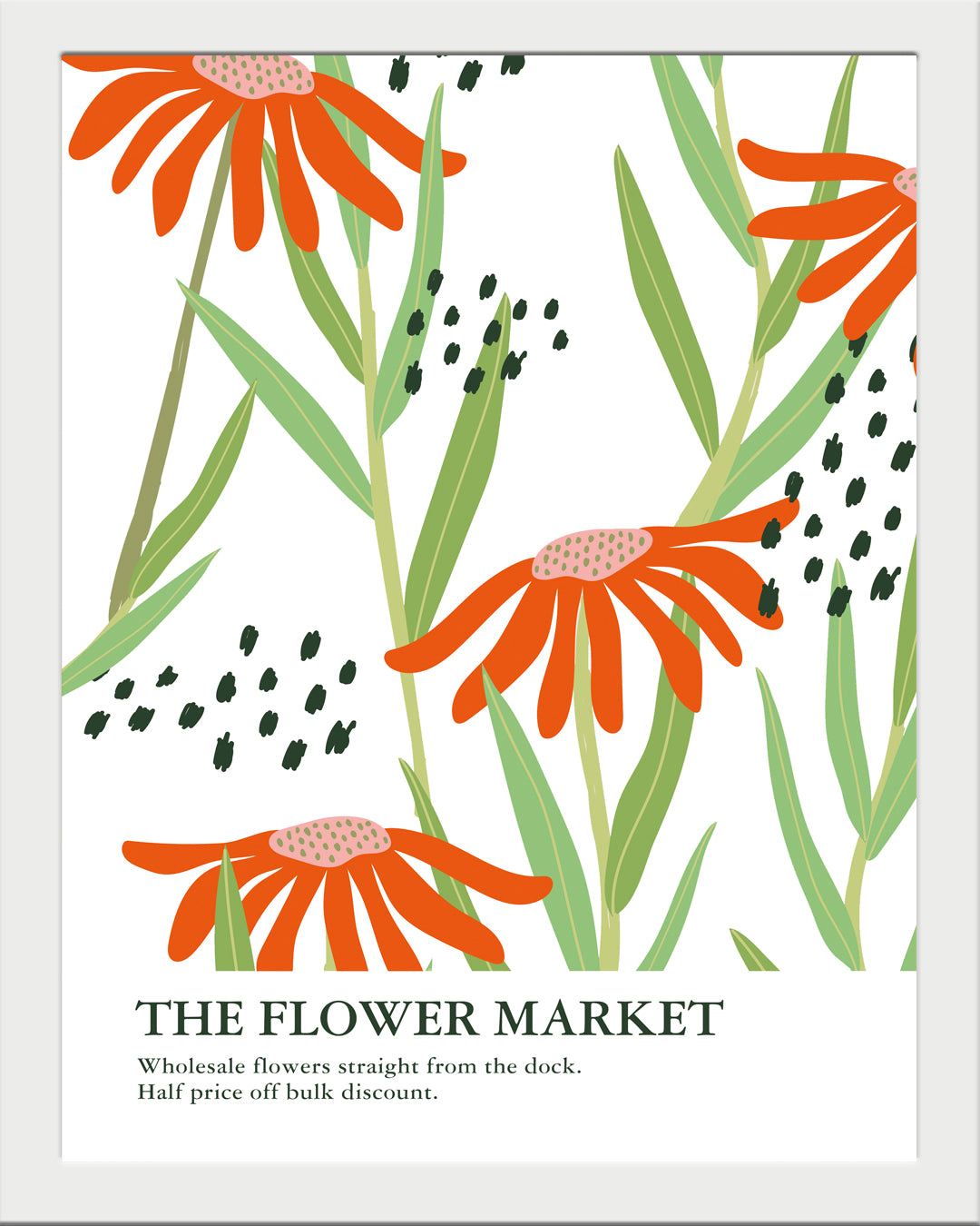 Descubre la audacia del color con este poster floral que desafía la sutileza. Flores de pétalos largos en rojo anaranjado explotan sobre un fondo blanco inmaculado, creando un contraste visual que demanda atención. Detalles de hojas verdes y pequeños puntos dispersos añaden movimiento y profundidad, transformando cualquier espacio en una galería de naturaleza salvaje. Inspirado en el estilo Flower Market, este cuadro unitario es perfecto para quienes se atreven a hacer una declaración audaz con su decoración.