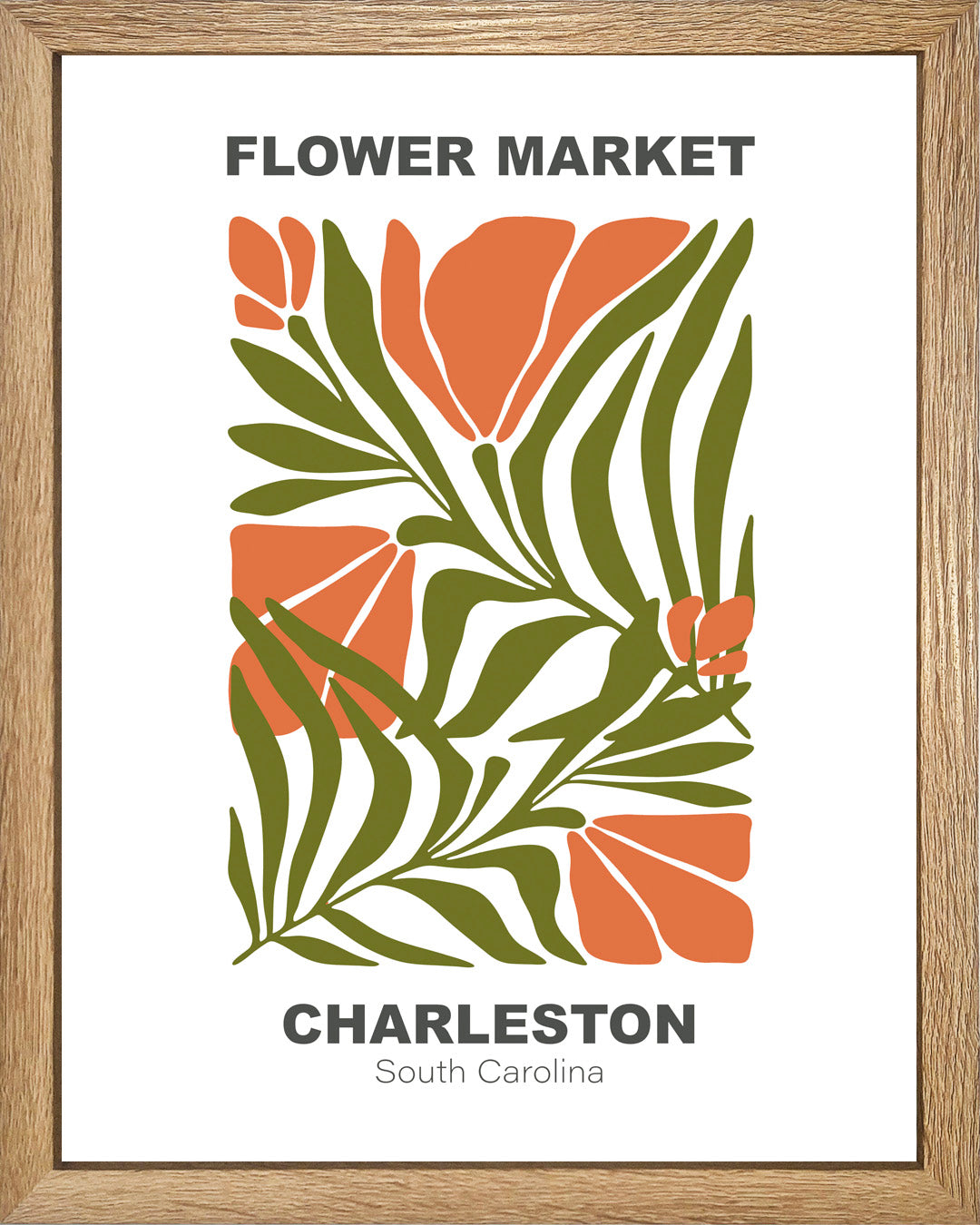 Flower Market Charleston captura la energía vibrante de un mercado floral en plena efervescencia. Este poster presenta flores naranjas audaces que explotan contra un fondo blanco limpio, acompañadas por largas hojas verdes que añaden movimiento y vida al diseño. Perfecto para quienes buscan inyectar color y personalidad a sus espacios sin compromisos. Una declaración visual que no pasa desapercibida.