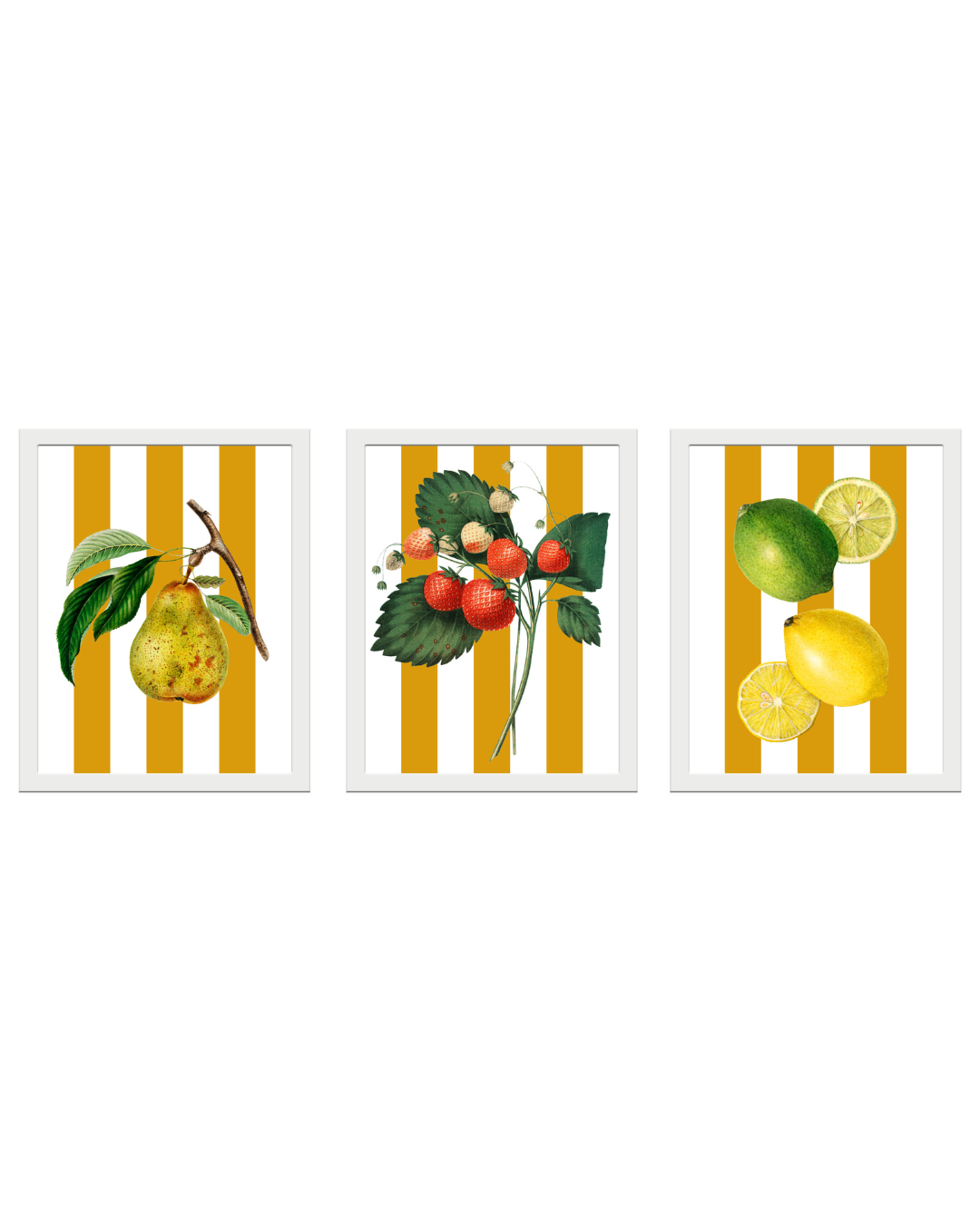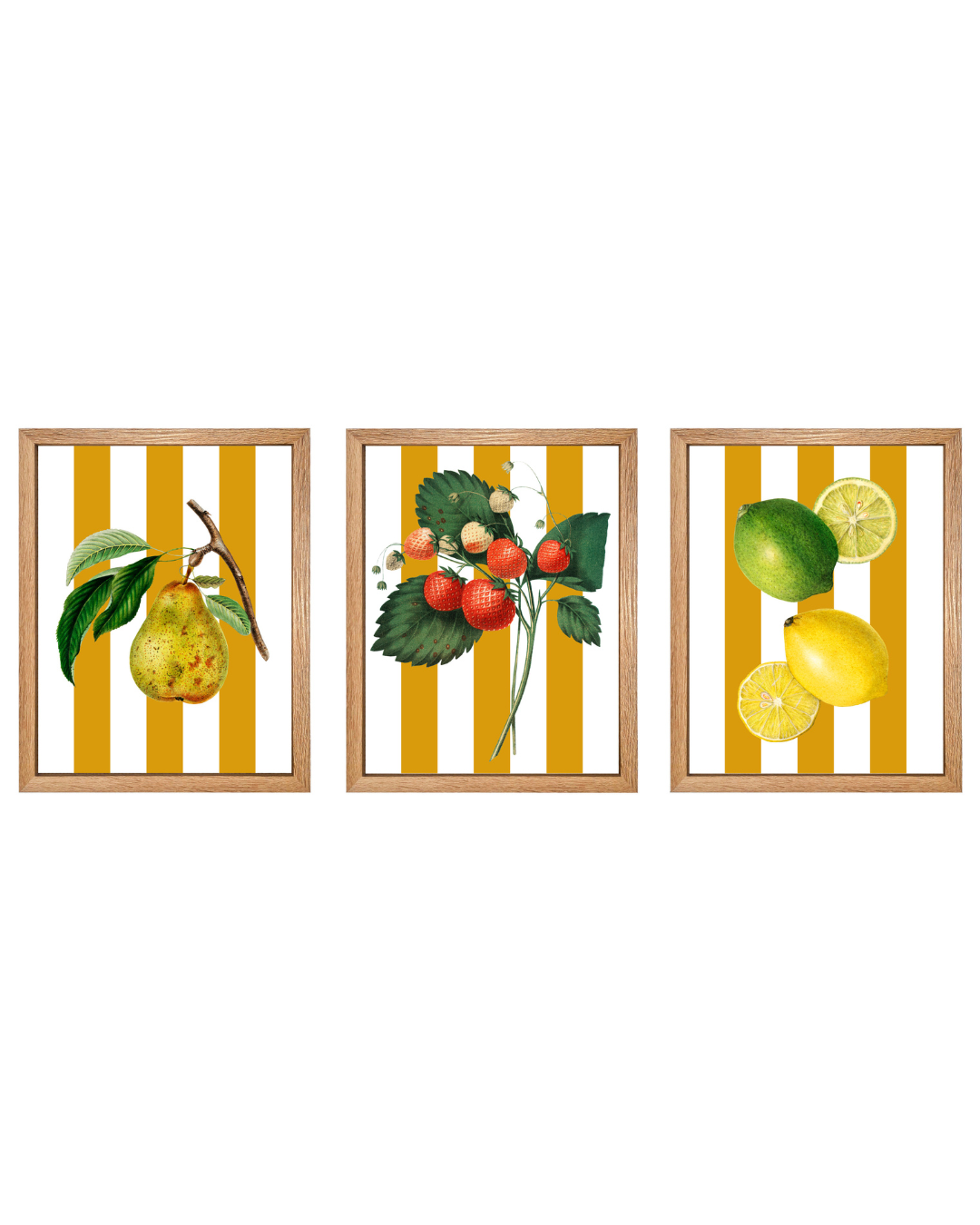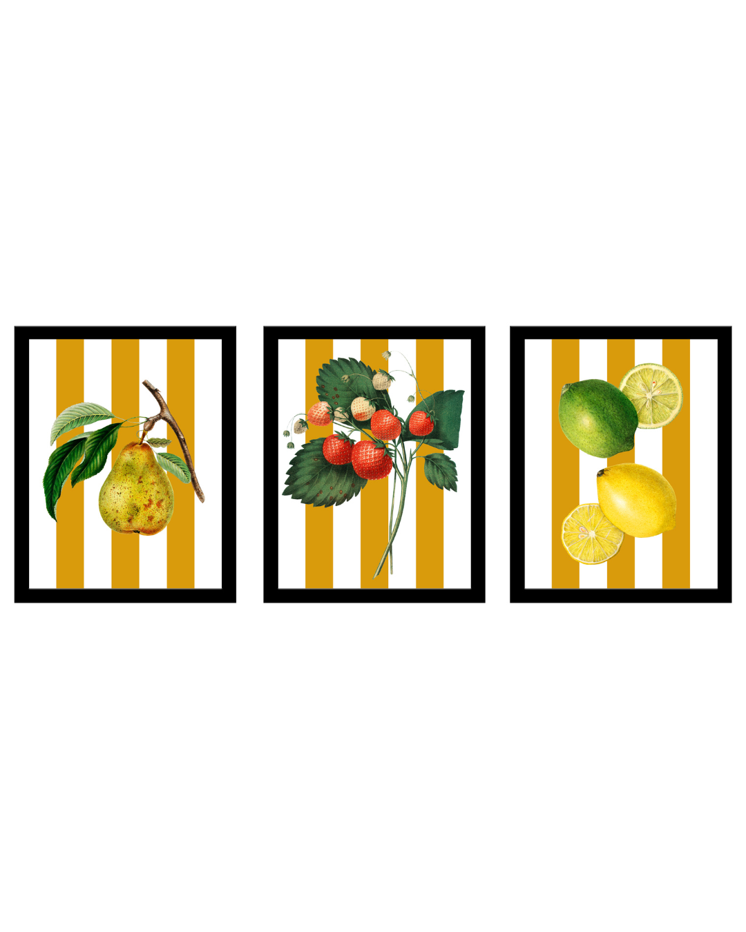 Tres obras audaces que desafían la monotonía. Cada cuadro captura una fruta diferente contra fondos de alto contraste dominados por gruesas rayas ocre que generan movimiento y tensión visual. Un tríptico que no pide permiso, que impone presencia y transforma cualquier espacio en una galería de arte contemporáneo. Perfecto para quienes buscan algo más que decoración: una declaración de estilo.