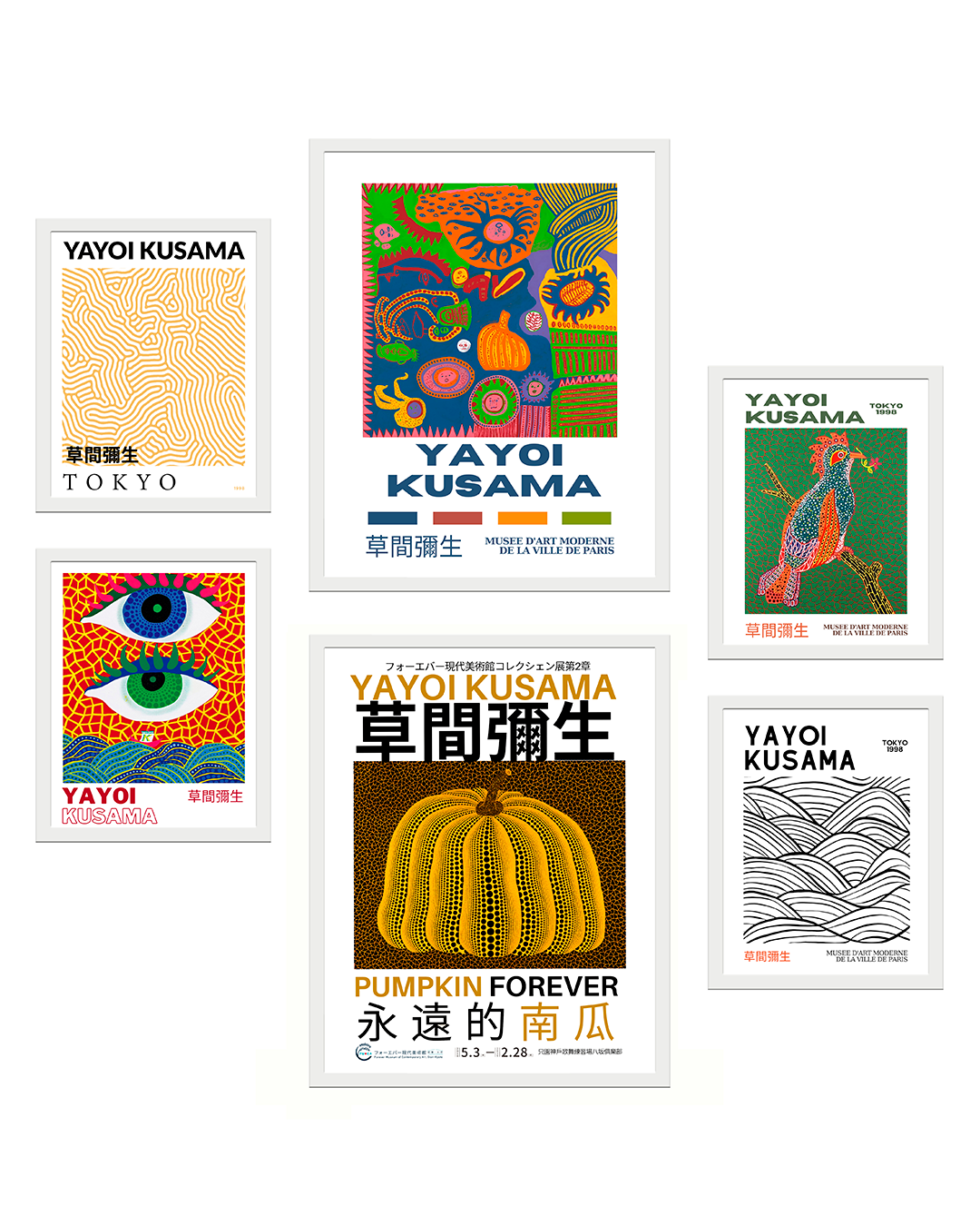 Esta composición presenta seis cuadros vibrantes, inspirados en el icónico estilo de Yayoi Kusama, fusionando puntos infinitos y patrones hipnóticos. Incluye algunas piezas originales de la artista, ofreciendo una experiencia visual audaz y envolvente que desafía la percepción y aporta un toque de arte contemporáneo impactante a cualquier espacio. Una colección que invita a explorar lo atrevido y lo creativo sin límites.