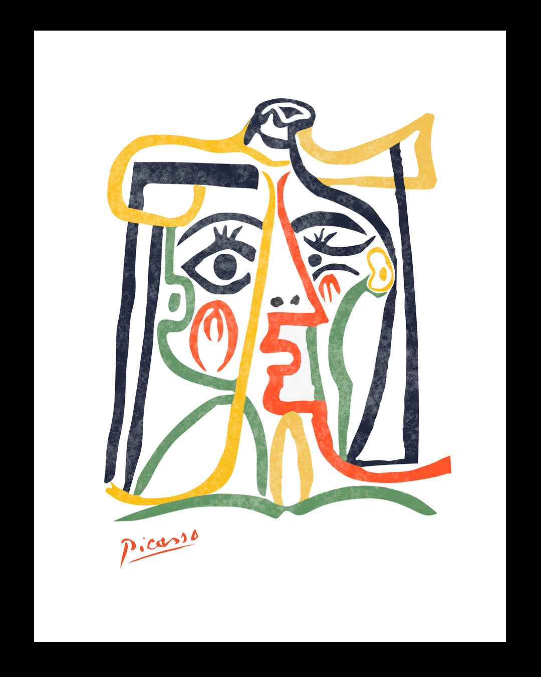 Dos identidades convergen en una sola presencia. Trazos gruesos y contundentes fusionan dos rostros en una composición que rechaza la simetría y abraza la complejidad, fiel al espíritu cubista de Picasso. Distintos colores crea un contraste que golpea, seduce y obliga a mirar más allá de la superficie. Una obra para espacios que demandan arte visceral, donde la dualidad humana se celebra sin filtros ni apologías.