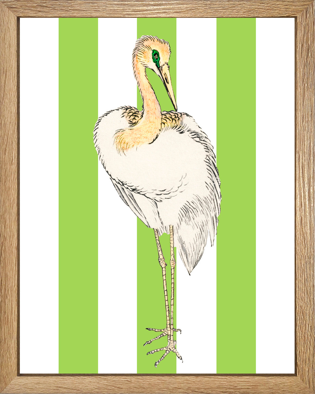 Capturando la esencia del minimalismo asiático con esta pieza audaz que retrata un ave de largas patas en pose serena y vigilante. El trabajo artístico fusiona la elegancia natural con la estética oriental, creando una composición que hipnotiza con su simplicidad. Cada trazo refleja la calma contemplativa y la precisión característica del arte asiático, contrastado con la franjas verdes del fondo. Una declaración visual perfecta para espacios que demandan sofisticación y un toque de misterio. Ideal para coleccionistas que aprecian la belleza en lo sutilmente atrevido.